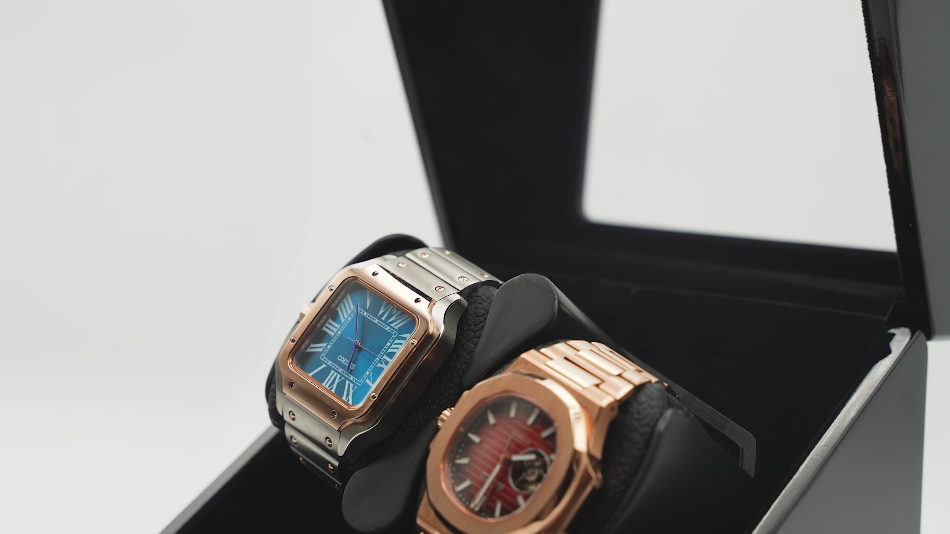 High-precision winder designed to keep two automatic watches running smoothly, ensuring accuracy and preventing power reserve depletion.