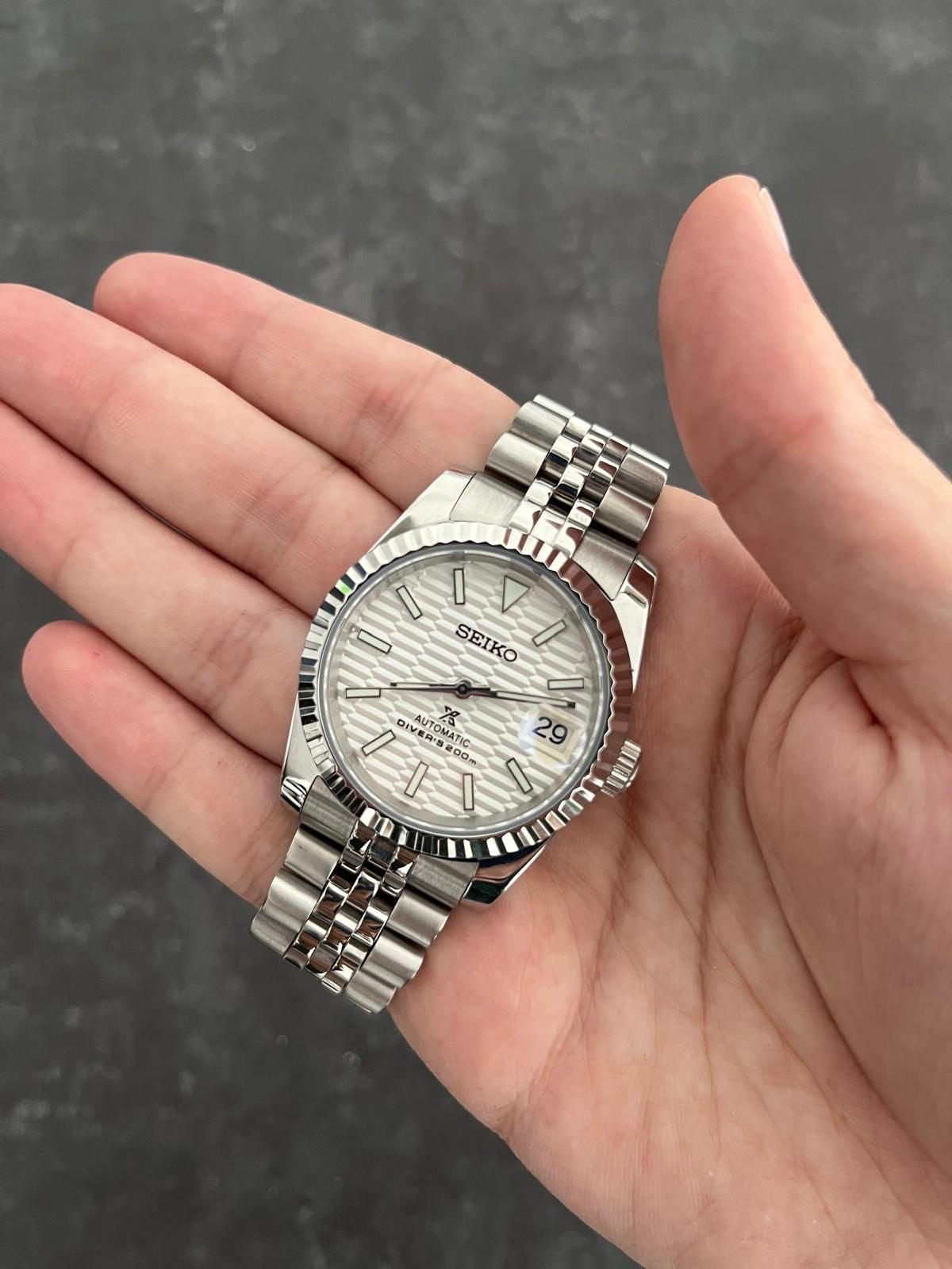 Inspired by the legendary Datejust design and powered by the renowned Seiko NH35 automatic movement, the Seiko Mod Datejust offers the perfect harmony between excellence and accessibility.